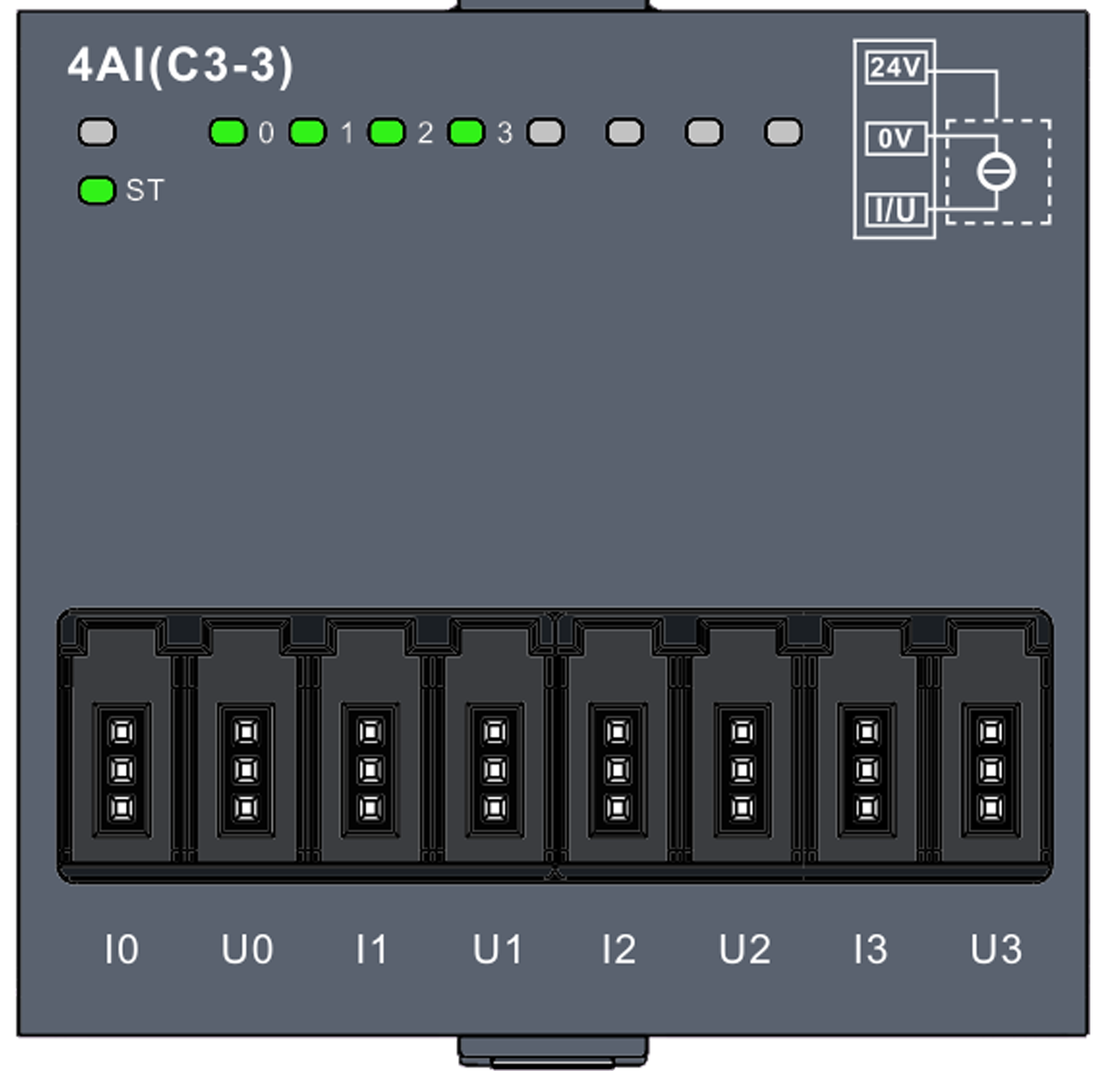 4AI(C3-1)4通道模拟量输入0-5V/±5V,0-10V/±10V,0-20mA/4-20mA,分辨率16bit,精度0.1%,用户量程可设置,单排欧式端子 ★面板(同一端子类型)为一个标准件*端子类型:单排欧式端子      信号模块:模拟量模块