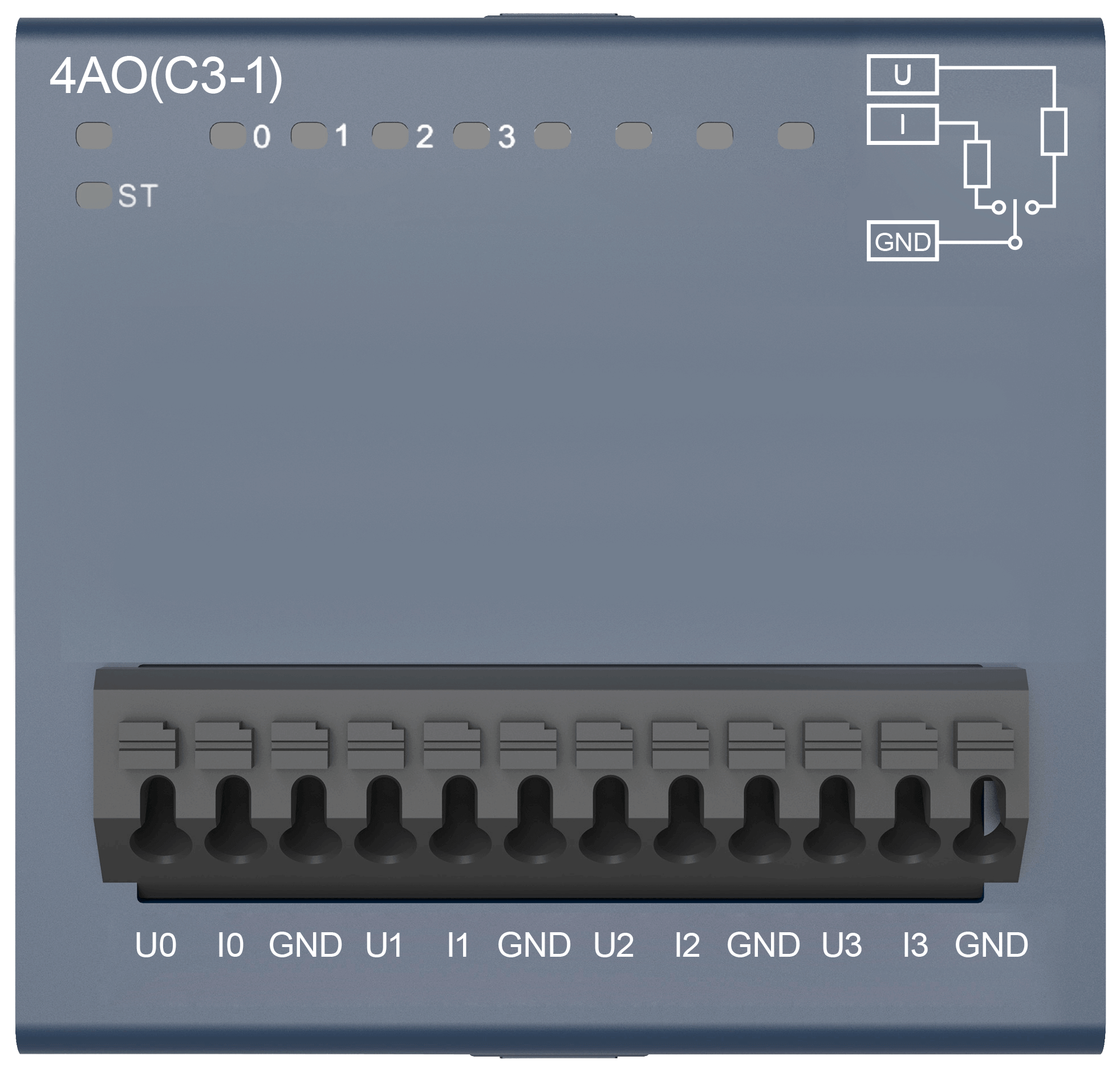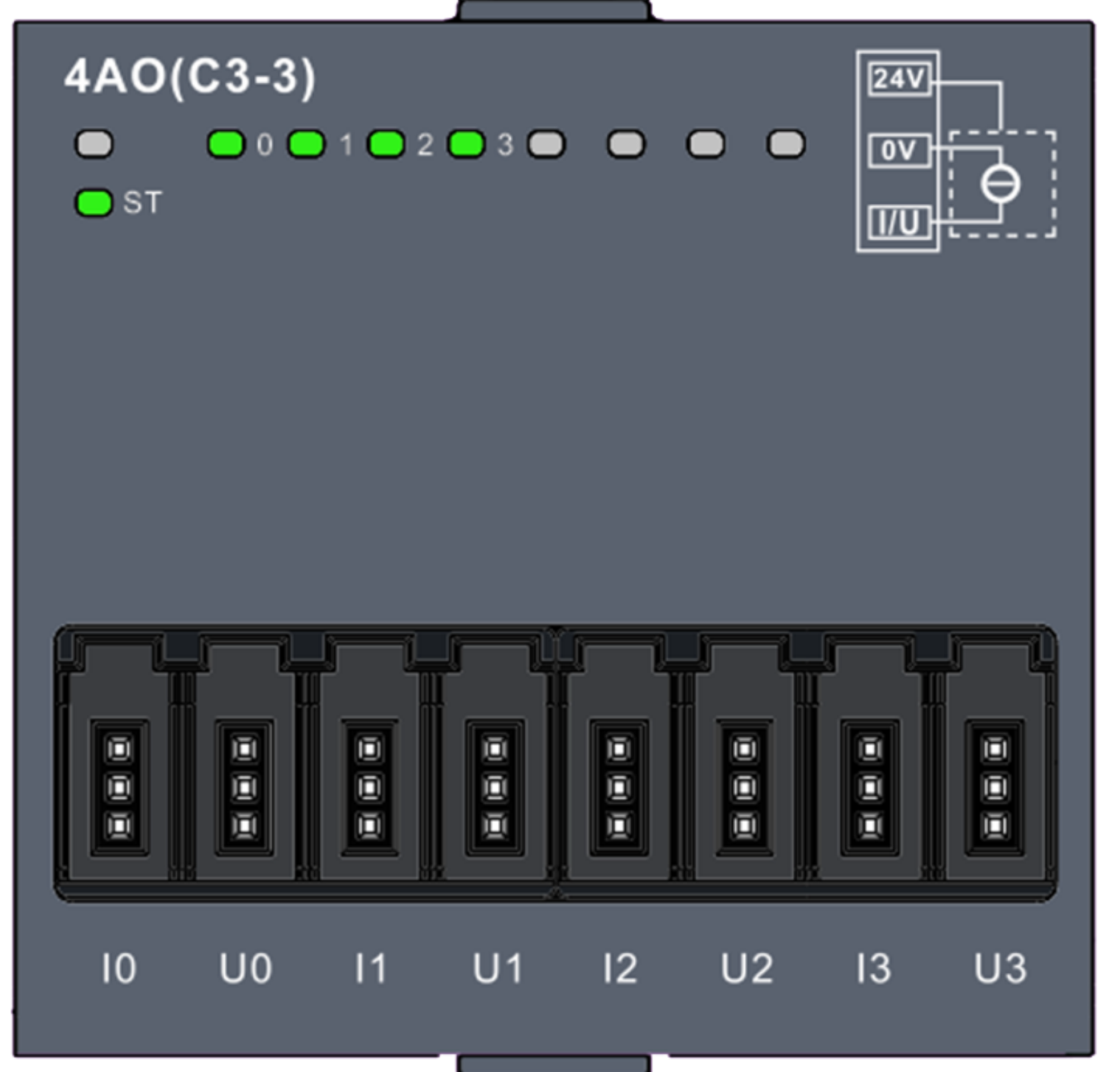 4AO(C3-3)4通道模拟量输出0-5V/±5V,0-10V/±10V,0-20mA/4-20mA,分辨率16bit ,精度0.1%,用户量程可设置,三位E-CON连接器 ★面板(同一端子类型)为一个标准件*端子类型:E-CON端子      信号模块:模拟量模块